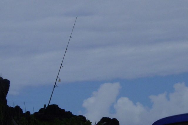 岩にちゃんと固定してさらにロープで竿を縛り イスを置いて ビールを飲みながら釣っておりました。いったいどの位のモノがかかるのだろう??